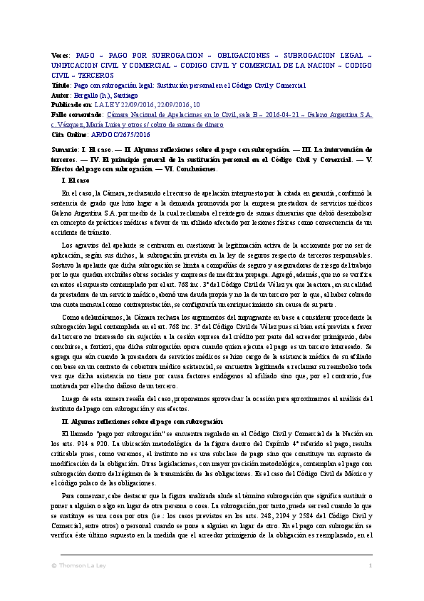 Doc Pago Con Subrogacion Legal Sustitucion Personal En El Codigo Civil Y Comercial Doc Santiago Bergallo H Academia Edu