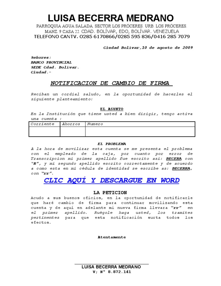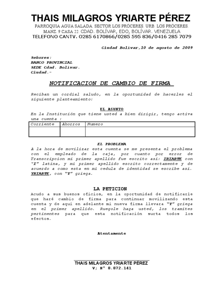 Modelo de carta para el cambio de firmas Maracaibo_____ de_____de _____. Notificacin que realizamos con la finalidad de hacer los cambios de firma de la cuenta No. Tiene una Cuenta en el Banco y necesita realizar un cambio de firma las razones pueden ser varias cambi de apellido se agreg un apellido le va a traspasar la cuenta a otra perona su hija por ejemlo le dejo este formato con Fe en Dios Seguro le ayudar.