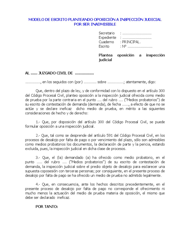 Modelo De Escrito Planteando Oposicion A Inspeccion Judicial Por Ser Inadmisible Demanda Judicial Ley Procesal
