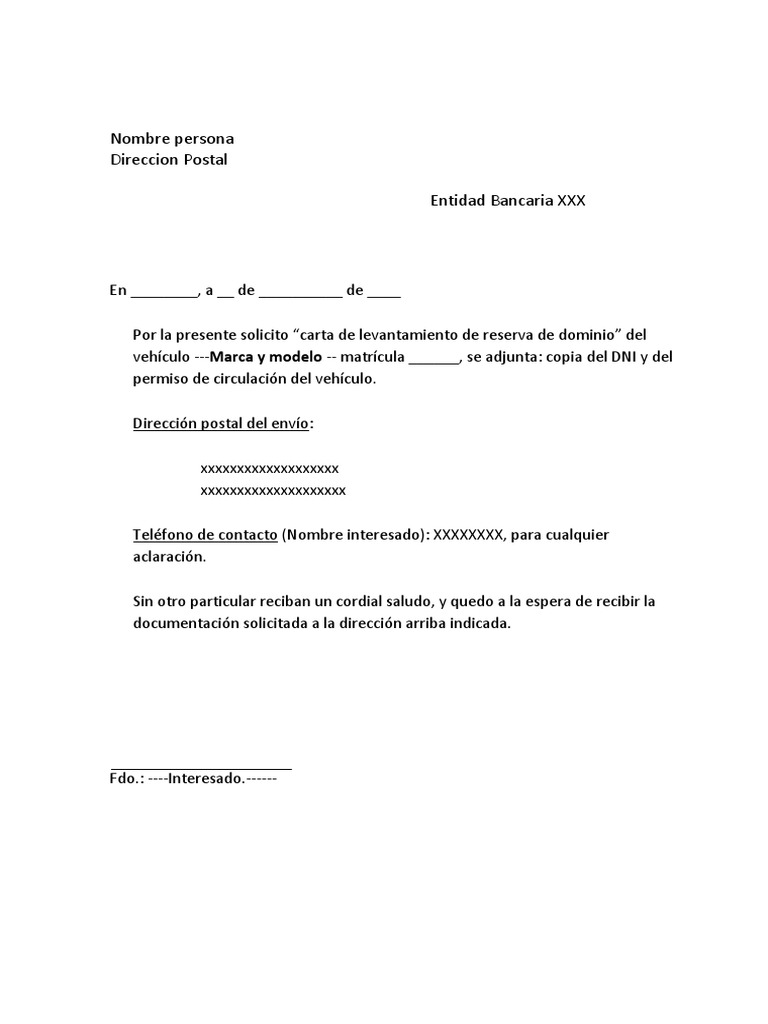 Nota simple del coche. Debe colocar el encabezado que se trata de una solicitud debe ser de esta manera. La cancelacin de reserva de dominio cesa los derechos de la financiera sobre un vehculo comprado al finalizar el pago.