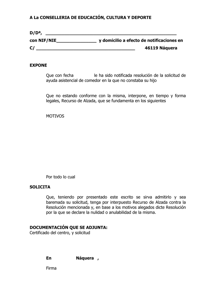 Modelo recurso de alzada educacion. Descargarte el impreso de alegaciones que aparece ms abajo rellenarlo y entregarlo en el centro docente en el que presentaste tu solicitud. MODELO RECURSO ALZADA CONTRA LAS LISTAS DE ASPIRANTES QUE HAN SUPERADO EL CONCURSO OPOSICIN PARA INGRESO EN EL CUERPO DE MAES. Qu requisitos debo cumplir.